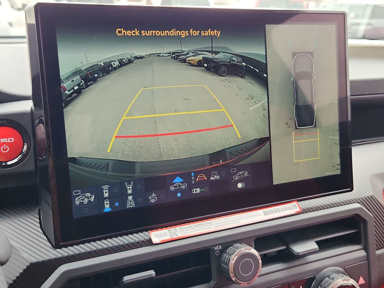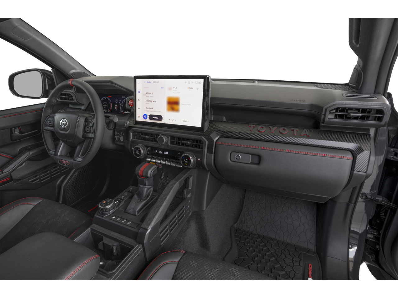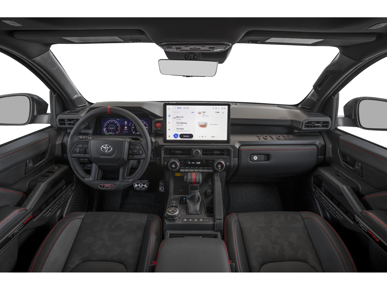 - TRD Pro leather-trimmed manual tilt/telescopic steering wheel with TRD badge, red center stripe, and phone, audio, display/infotainment, and Driver Assist controls