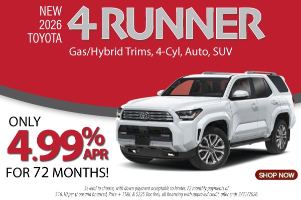 Several to choose, with down payment acceptable to lender, 72 monthly payments of $16.10 per thousand financed, Price + TT&L + $225 Doc Fees, all financing with approved credit, offer ends 3/31/26.