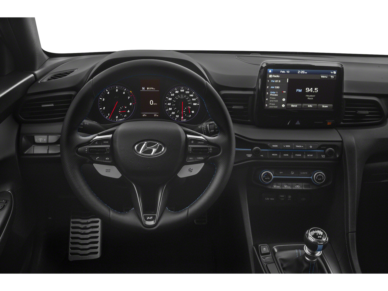 PERFORMANCE PACKAGE Option Group 02, Tires: 235/35R19 Summer, Wheels: 19 x 8.0J Alloy, Engine: 2.0L Turbo GDI E-CVVT 4-Cylinder DOHC, Variable Exhaust Valve System, Transmission: 6-Speed Manual, drive mode selection system (normal, eco, sport, N, N custom), rev matching and hill start assist, N Corner Carving Differential, Limited slip differential w/electronic control, 13.6 Front Rotors & 12.4 Rear Rotors, Front and rear ventilated. Hyundai Veloster N with PHANTOM BLACK exterior and BLACK interior features a 4 Cylinder Engine with 250 HP at 6000 RPM*.